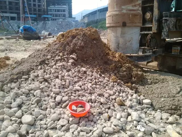 地勘报告显示,素填土层中底部有较早抛填的大块花岗岩,粒径在0.5~2.0mm不等。除此之外,在②-2的卵石层的卵石密度达到密实级,含量50~60%,一般粒径为20~100mm,最大达400mm,亚圆形为主,分选性较差,质地坚硬,母岩成分为凝灰岩、花岗岩等,中~微风化为主,充填物为砂砾及粘性土,无胶结,钻探中孔壁易塌。